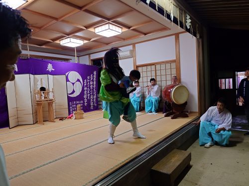 神楽の余興では赤ちゃん抱っこで健やかな成長を祈願します。