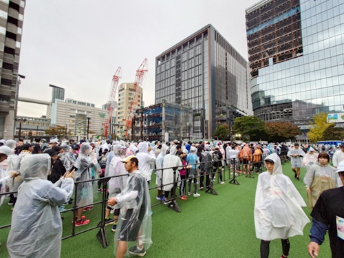 天気予想は雨でしたので、100円ショップで調達しておいたレインコートを着て待機。