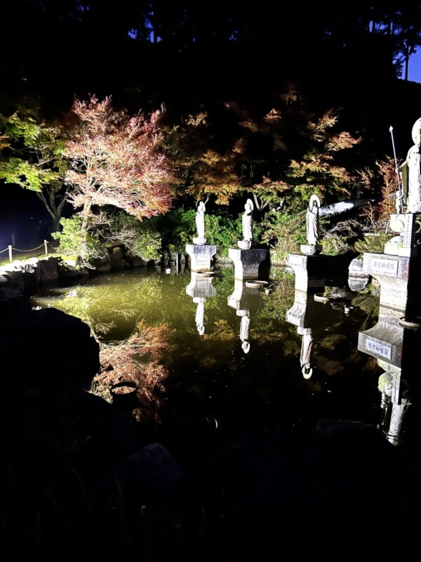 少しだけライトアップされていて、池に綺麗に反射して映っています。