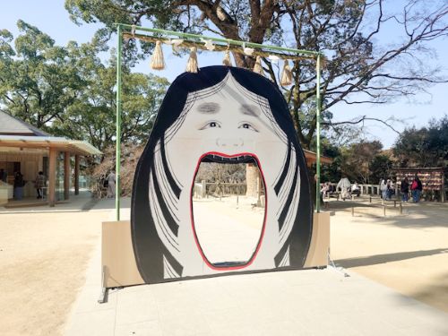 表が鬼、裏がおたふくになっており、ご参拝前に鬼門をくぐり鬼(災い)を祓い、