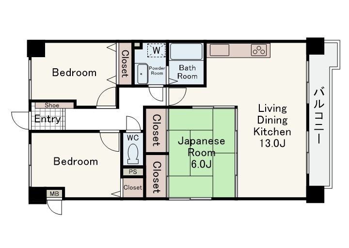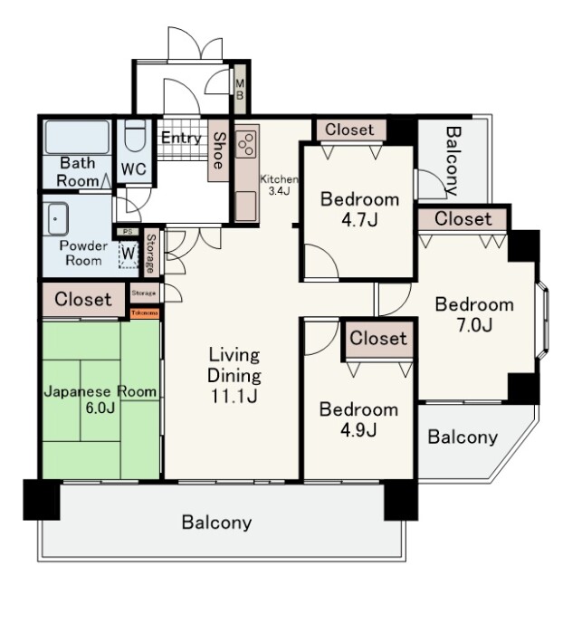 南西向きの日当たりの良い角部屋です。どのお部屋もバルコニーに面しています。バルコニーは三カ所あり、二面採光になります。