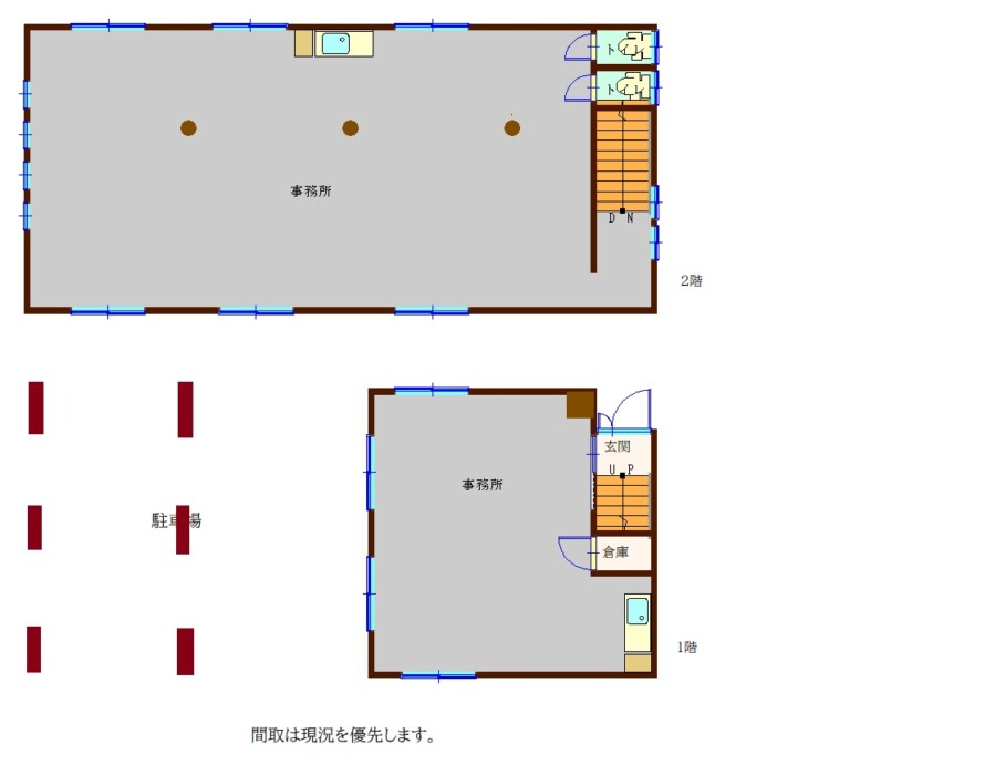 1階は、事務所と駐車場、2階は事務所になっています。